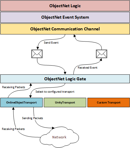 The following drawing illustrates how ObjectNet abstracts its internal behavior from the configured transport system.