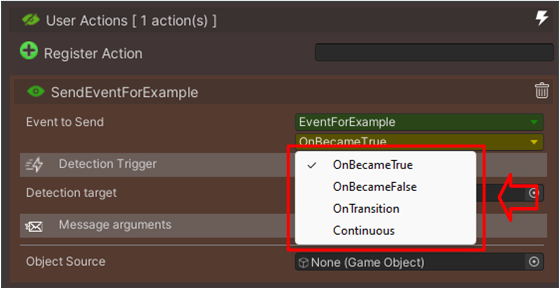 On this part you can select component ( script ) attributes or function witch return allowed types. The system will evaluate this condition on each execution frame to check if condition is reached.