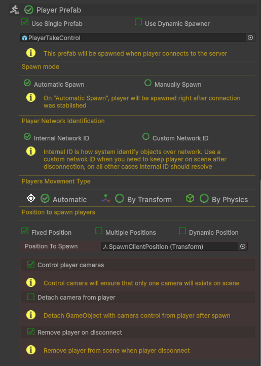 In the image above, every time a player enters a game the prefab "Player Armature" will be spawned and associated with this player.