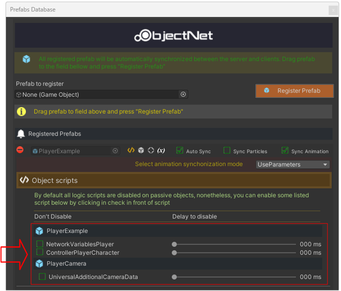 In case any script needs to be executed before being disabled ( if some data was collected in OnAwake on OnStart methods ) you shall keep the checkbox unchecked and use the slider to tell to ObjectNet to disable this script only after a certain amount of time.